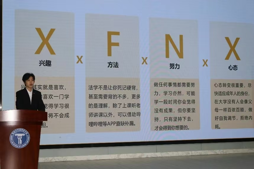 法学2404班李兆忆学长结合自身大一学习经历,总结出“十字真言”式学习方法。“法趣先培育,学循渐进阶”,他建议从《法律与文学》《洞穴奇案》等书籍或法律相关影视入手,唤醒对法学的兴趣;“初时课业闲,治学重预复”,强调课前预习标记疑问、课后复习,借助教材理清知识逻辑,推荐合众教育等线上课程补充学习;“问师解律惑,善问促学深”,鼓励主动向老师请教法理学、宪法学等难点知识;“随处皆可学,心安便为斋”,指出校园各处皆可作为学习场所,关键在主动学习;“外语莫搁置,常温保语感”,提醒新生在大一保持英语学习节奏,为后续备考筑牢基础。生活上,他建议通过社团活动、志愿服务丰富校园体验,拓宽成长边界。