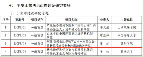 近日,山东省哲学社会科学工作办公室公布《2025年度山东省社科规划研究专项立项名单》。经通讯初评、会议评审、社会公示等程序,我院单佳博士申报的《精准治理民营企业内部腐败犯罪的司法认定难点与防控策略研究》获批“平安山东法治山东建设研究专项”之“法治建设研究专题”立项。