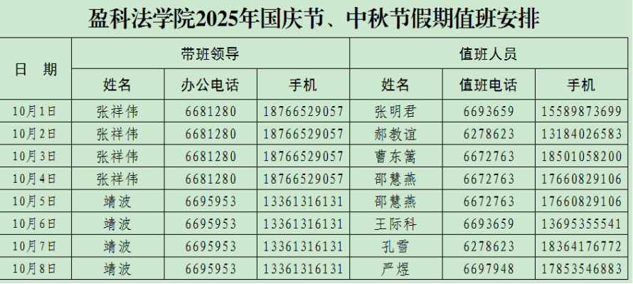 盈科法学院2025年国庆节、中秋节假期值班安排