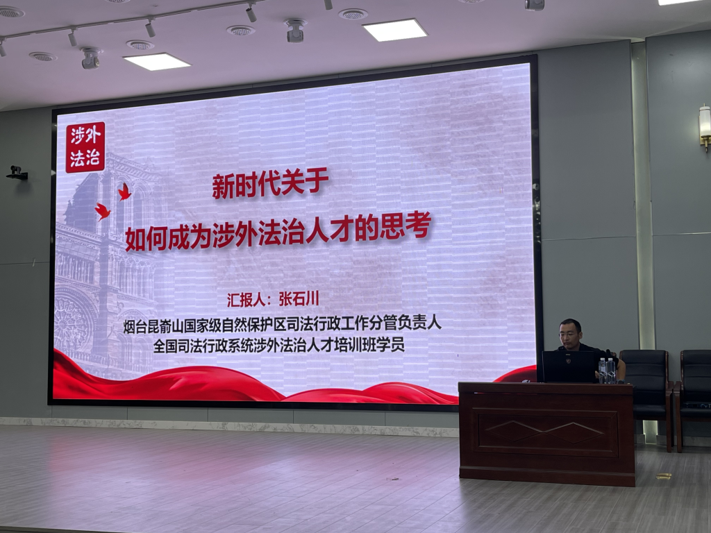 本次讲座由烟台昆嵛山国家级自然保护区司法行政工作分管负责人、全国司法行政系统涉外法治人才培训班学员张石川担任主讲嘉宾。张石川以“新时代关于如何成为涉外法治人才的思考”为主题,通过对“瑞幸咖啡泰国商标侵权案”和“迈克尔·乔丹诉乔丹体育案”两个典型案例的细致剖析,阐释了涉外法治在维护国家利益、保障企业跨境权益、推动全球治理中的多维内涵与重要价值。在此基础上,张石川进一步聚焦涉外法治人才的核心能力培养,建议法学学子应从筑牢法律深度的根基、握紧语言工具的抓手,开拓跨界思维的视野这“三维能力体系”出发构建自己的涉外法治竞争力。